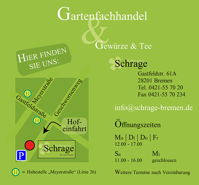 Gartenfachhandel Schrage. Gastfeldstr. 61A, 28201 Bremen. Telefon: 0421 557020 Fax: 0421 5570234